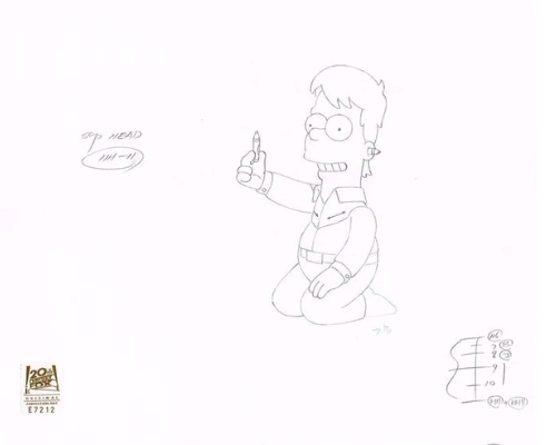 This is an original production drawing used in making "The Simpsons". Episode BABF14 titled "HOMER" January 7, 2001. In the episode Homer invests all the family's money in a company that makes `Animotion' machines. After the company declares bankruptcy, Homer becomes a human guinea pig to raise some cash. The scientists find a crayon lodged in his brain and when it is removed, he suddenly becomes extremely intelligent. Featured here is Homer Simpson.