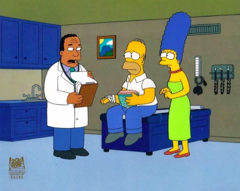 This is an original hand painted production cel. This was used in making an episode of "The Simpsons". Episode titled "Trilogy of Error" April 29, 2001. Featured here are Homer Simpson, Dr. Hibbert and Marge Simpson.