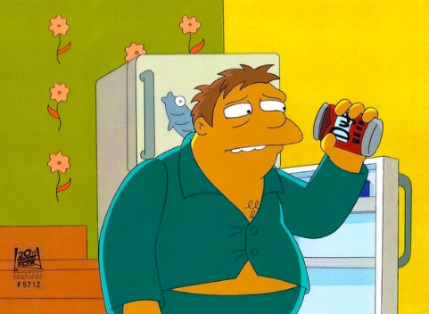 This is an original hand painted production cel used in making an episode of "The Simpsons". Episode AABF02 title "D'oh-in in the Wind" November 15, 1998. Featured here is Barney Gumble.