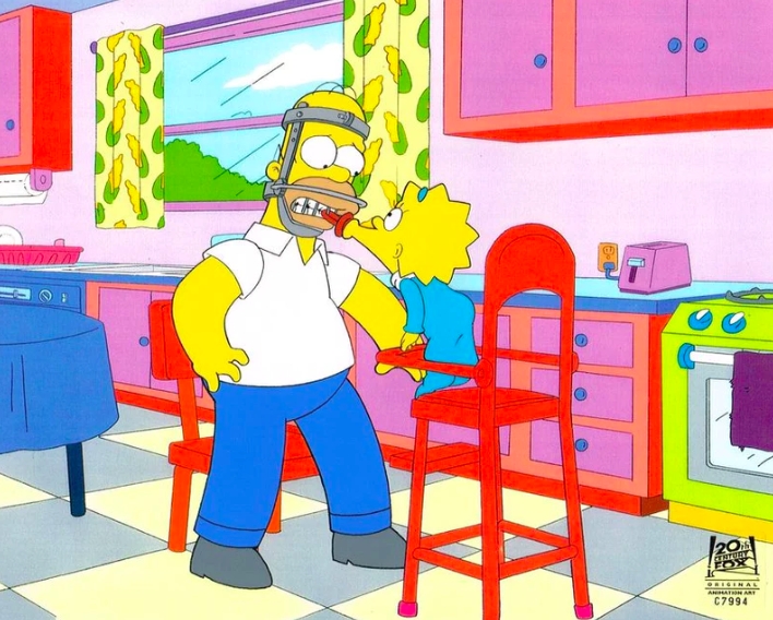This is an original hand painted production cel. This was used in making an episode of "The Simpsons". Featured here are Homer Simpson and Maggie Simpson.