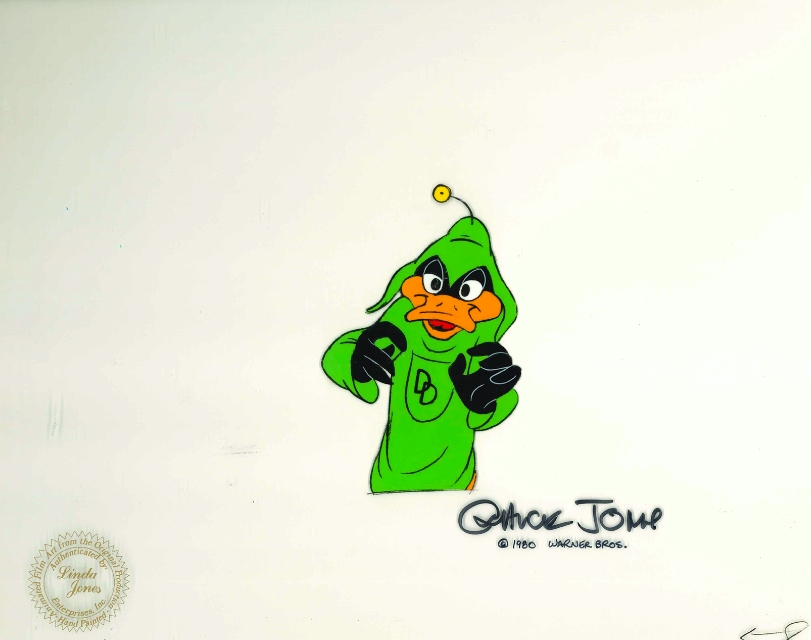 This is an original hand painted production cel used in making "Duck Dodgers and the Return of the 24 1/2 Century" 1980. This was personally signed by Chuck Jones. Featured here is Daffy Duck.