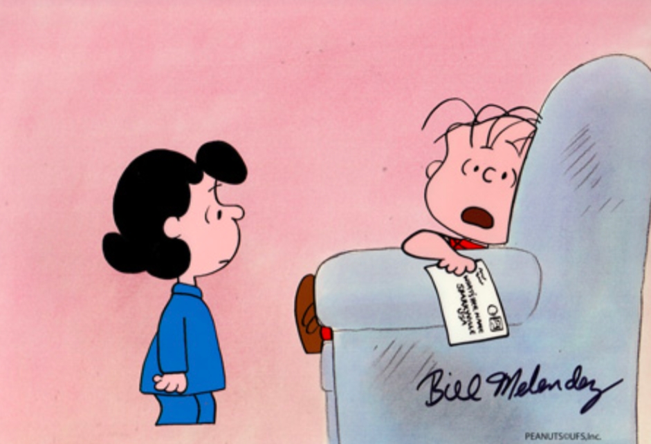 This is an original color model animation cel set-up with 2 original production drawings used in making "Charlie Brown's Christmas Tales" 2002. The cel and drawing are signed by Bill Melendez. Featured here are Lucy and Linus.