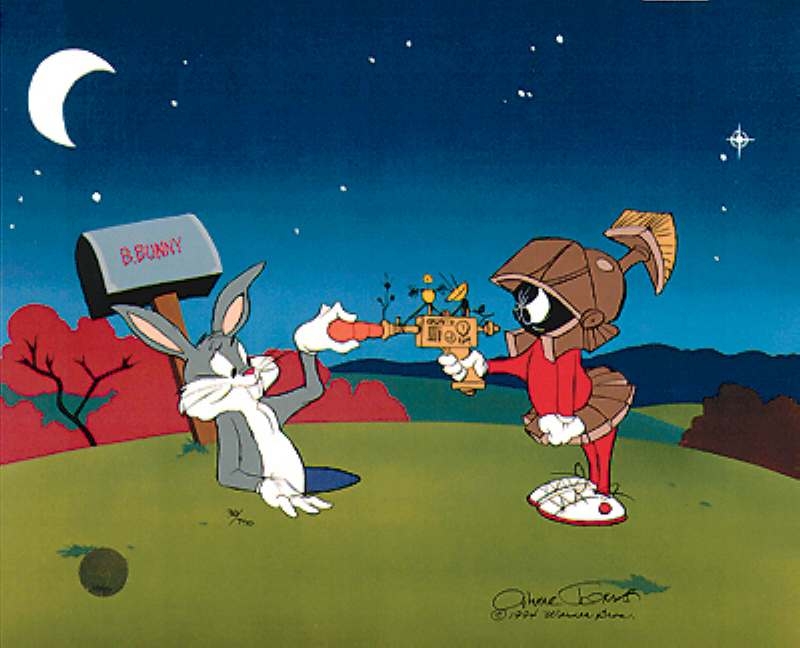 This is a hand painted limited edition cel featuring Bugs Bunny and Marvin the Martian. This has been signed by Chuck Jones.