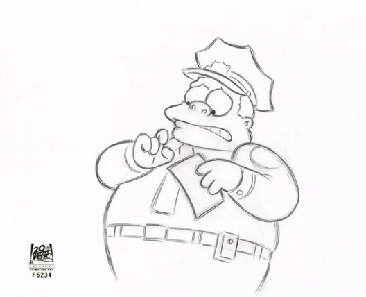 This is an original production drawing used in making The Simpsons. Episode 3F15 title "A Fish Called Selma" March 24, 1996. Featured here is Chief Wiggum.