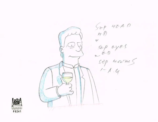 This is an original production drawing used in making The Simpsons. Episode 3F15 title "A Fish Called Selma" March 24, 1996. Featured here is Troy McClure.