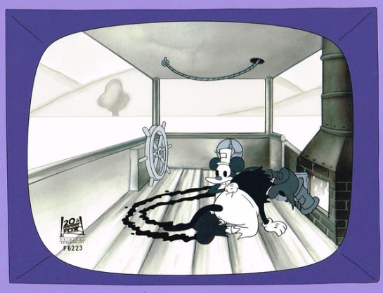 This is an original hand painted production cel used in making an episode of "The Simpsons". Episode 9F03 title "Itchy and Scratchy The Movie" November 3, 1992. Featured here is Itchy and Scratchy. This Itchy & Scratchy short titled "Steamboat Itchy" is a parody of the 1928 Disney short "Steamboat Willie" which featured Mickey Mouse.