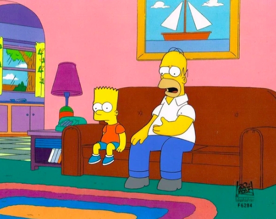 This is an original hand painted production cel used in making an episode of "The Simpsons". Episode title "Missionary Impossible" February 20, 2000. Featured here are Bart Simpson and Homer Simpson.