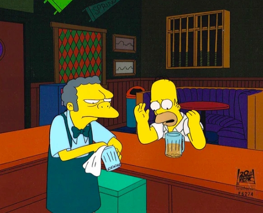 This is an original hand painted production cel. This was used in making an episode of "The Simpsons". Episode 5F09 titled "Trash of the Titans" April 26, 1998. Featured here is Homer Simpson. CUT SCENE: This original production cel was cut before the final edit.