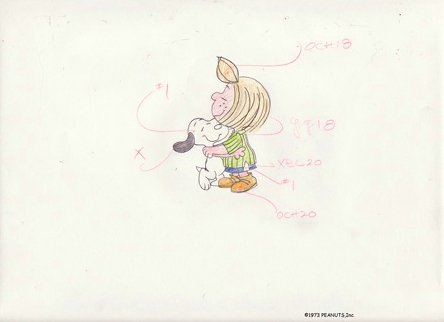 This is an original production drawing detailed in full color. This was used in making "Race for Your Life, Charlie Brown" 1977. Featured here are Snoopy and Peppermint Patty.