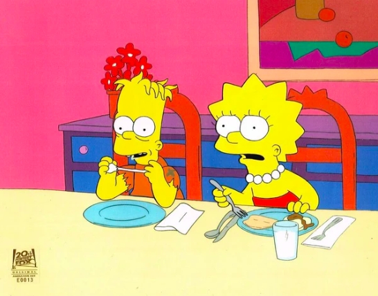 * SOLD * This is an original hand painted production cel. This was used in making an episode of "The Simpsons". Episode titled "Treehouse of Horror Vll" October 27, 1996. Featured here are Hugo and Lisa Simpson.