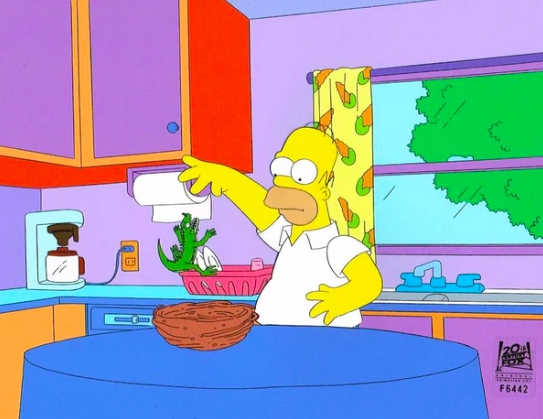 This is an original hand painted production cel. This was used in making an episode of "The Simpsons". Episode titled "Bart the Mother" September 27, 1998. Featured here is Homer Simpson.