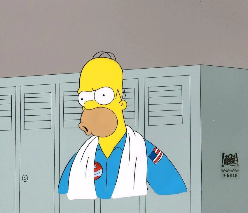 This is an original hand painted production cel used in making an episode of "The Simpsons". Episode 1F13 "Deep Space Homer" Feb. 24, 1994. Featured here is Homer Simpson.