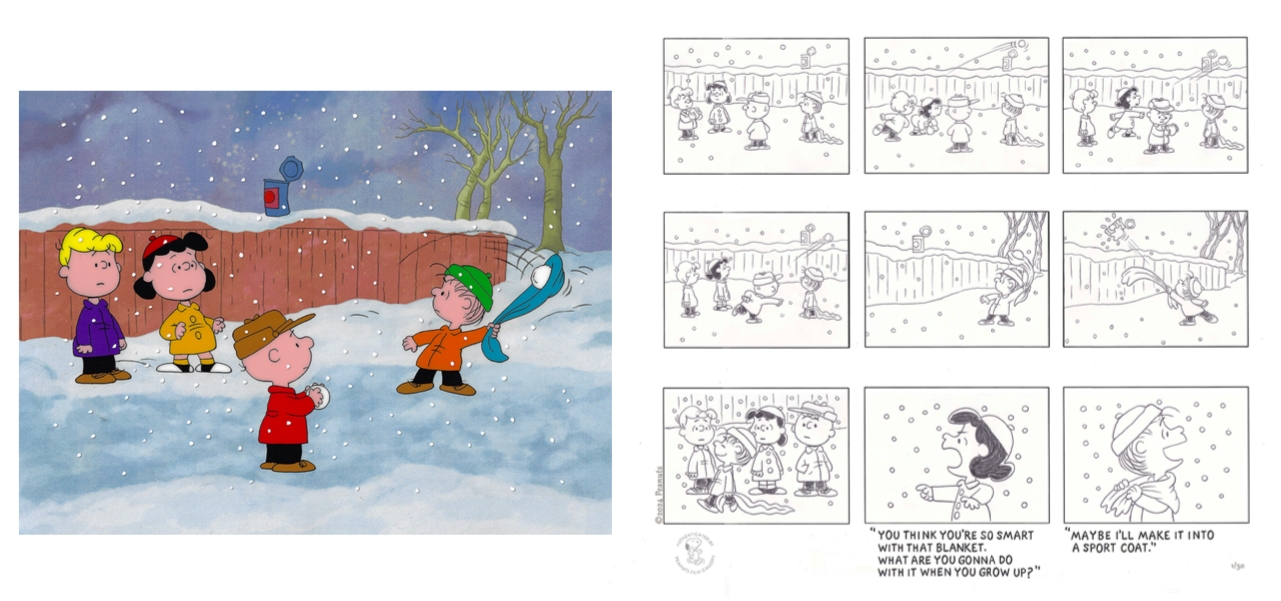 This is a hand painted and hand-inked limited edition cel. This is a two layer cel set-up presented on a giclee background print. Featured here are Charlie Brown, Lucy, Schroeder and Linus. This cel setup was enhanced with the blanket's motion lines drawn by Larry. This cel is accompanied by a story board giclee print depicting the action of the scene and can be framed separately for an additional $225. Both are signed by Mr. Leichliter. The art bears the studio seal of authenticity and comes with a certificate of authenticity.