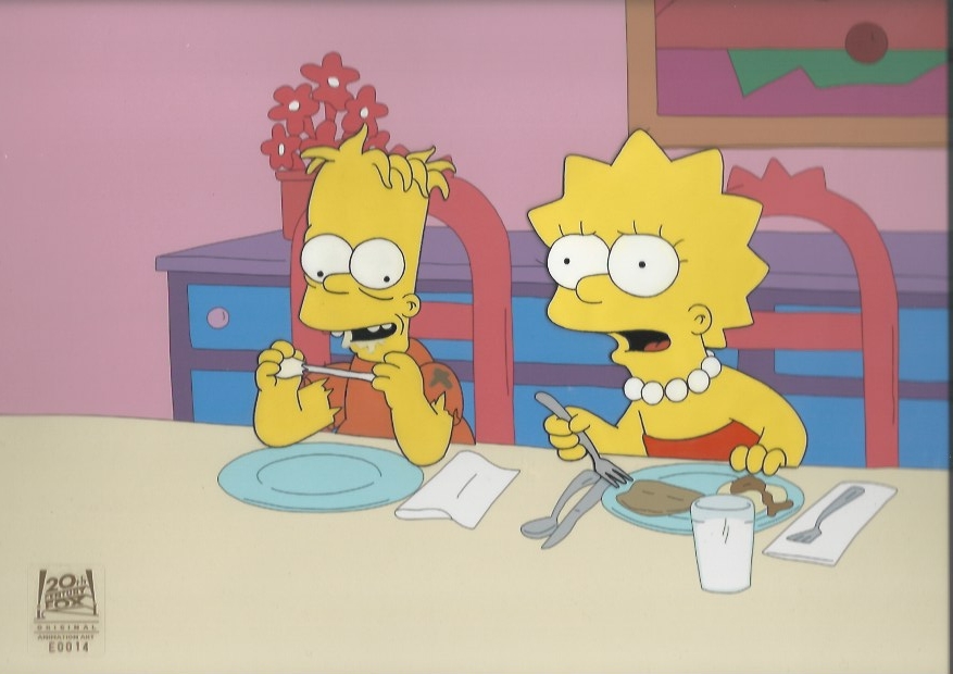 This is an original hand painted production cel. This was used in making an episode of "The Simpsons". Episode titled "Treehouse of Horror Vll" October 27, 1996. Featured here are Hugo and Lisa Simpson.