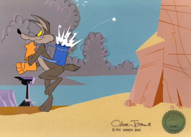 This is a hand painted original production cel used in making "Chariots of Fur" 1994. Featured here is Wile E. Coyote. This cel has been signed by the late Chuck Jones.