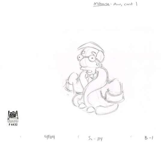This is an original production drawing used in making The Simpsons. Episode "A Milhouse Divided" December 1, 1996. Featured here is Milhouse.
