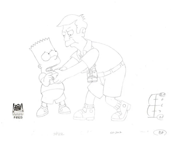 This is an original production drawing used in making The Simpsons. Episode "Bart the Mother" September 27, 1998. Featured here are Bart Simpson and Principle Skinner.