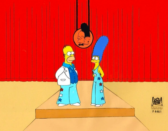 This is an original production cel used in making an episode of "The Simpsons". Episode "The Simpsons Spin-Off Showcase" May 11, 1997. Featured here are Homer Simpson and Marge Simpson.