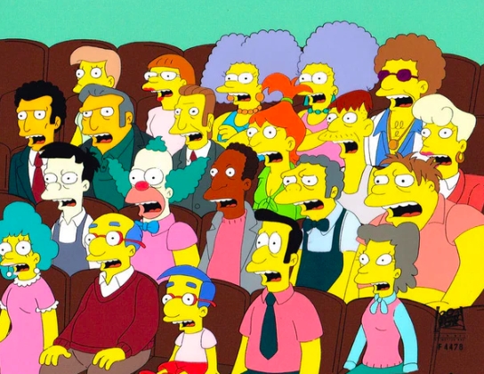 This is an original production cel used in making an episode of "The Simpsons". Episode "Treehouse of Horror Xl" November 1, 2000. Featured here are great group of characters...Disco Stu, Patty and Selma, Barney, Hubert Wong, Fat Tony, Legs, Milhouse, Moe, Krusty, Carl, Cletus, Reverend Lovejoy, Helen Lovejoy, Kirk Van Houten.