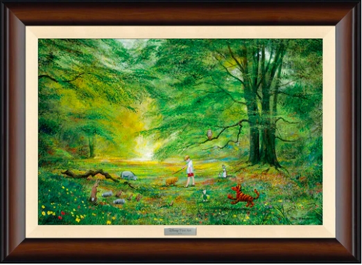 This is a limited edition giclee on canvas and comes framed as you see it, ready to hang. By Disney artists Harrison and Peter Ellenshaw. Featured here are Winnie the Pooh, Eeyore, Piglet, Tigger, Owl, and Rabbit. Contact us for shipping quote outside of North America.