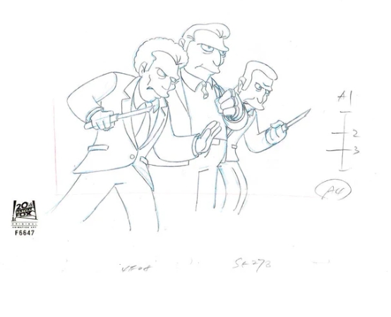 This is an original production drawing used in making The Simpsons. Episode "The Twisted World of Marge Simpson" January 19, 1997. Featured here is Fat Tony, Louie and Legs.