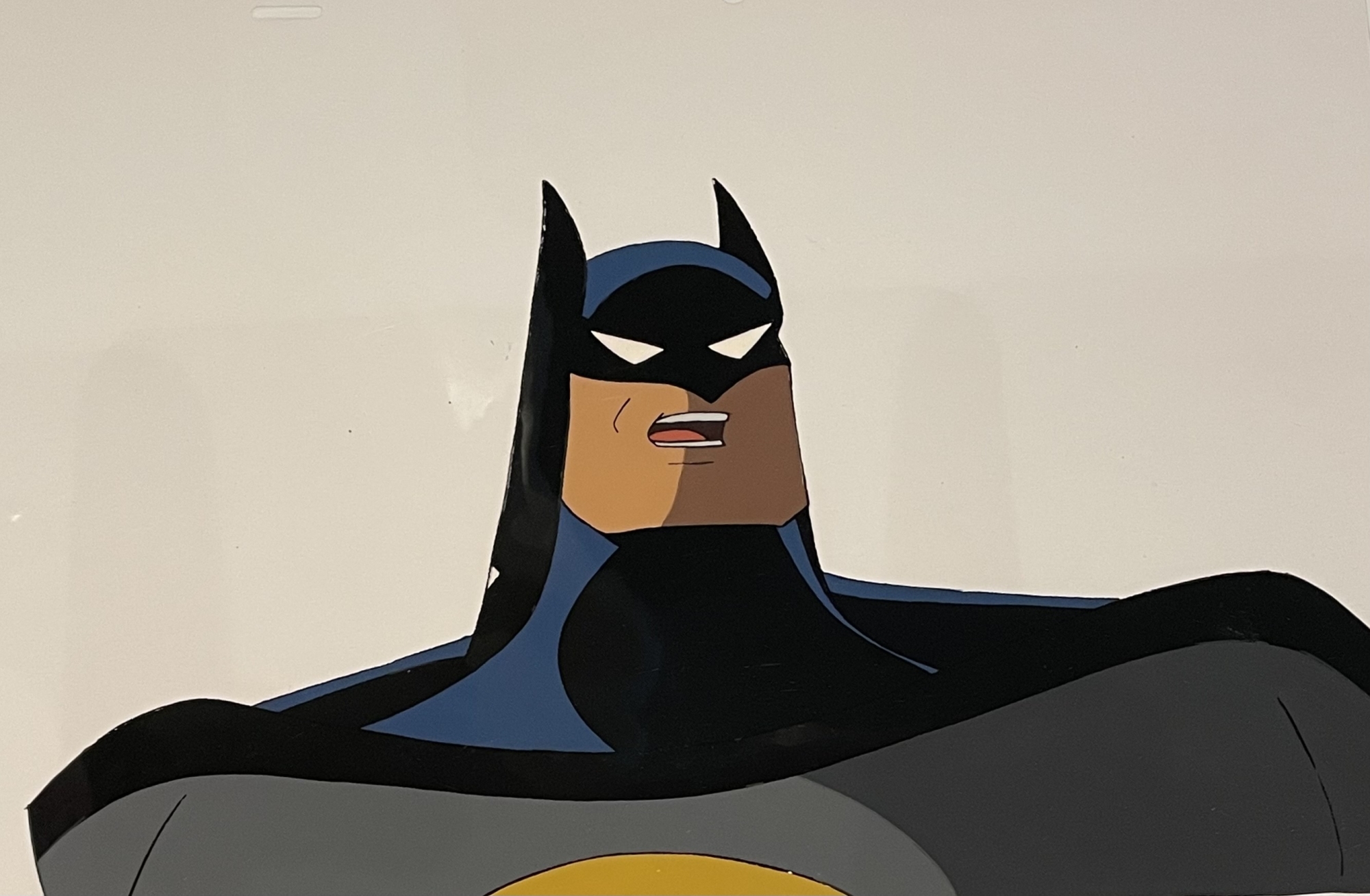 This is an original hand painted production cel of Batman. Comes with a gallery certificate of authenticity. Note there are a few paint chips. Featured here is Batman.