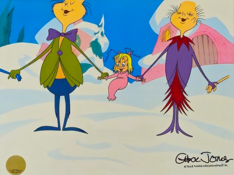 This is a hand inked, hand painted limited edition cel 1/1. "How The Grinch Stole Christmas" 1966. Featured here are the Whos and Cindy Lou Who. This bears the Chuck Jones Estate Signature Mark as authentication. Unframed only.