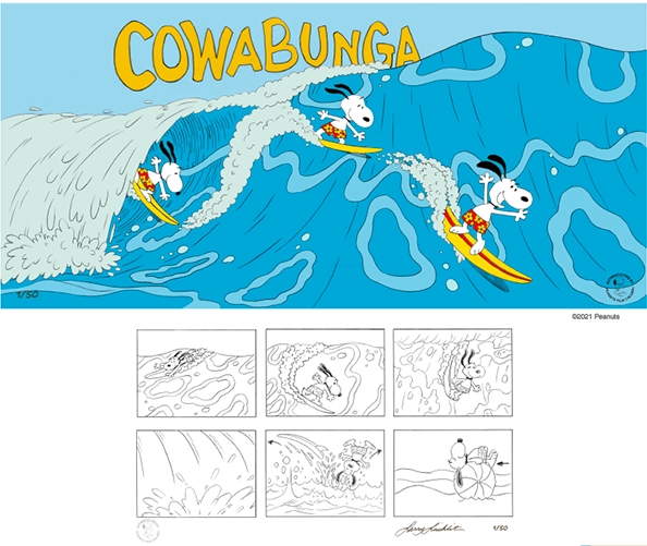 This is a hand-inked and painted limited edition cel set-up. is based on the opening sequence in this full featured film. Three poses of Snoopy surfing are featured here. The cel comes with a signed giclée print story board, the original artwork was created by Larry Leichliter. Available unframed.
