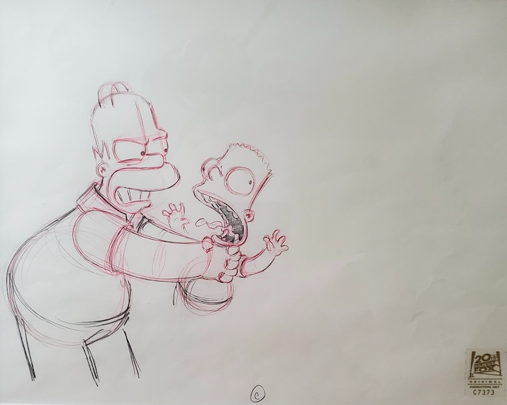This is an original production drawing used in making an episode of The Simpsons. Episode DABF13 "I am Furious (Yellow)" April 28, 2002. Featured here are Homer Simpson and Bart Simpson.