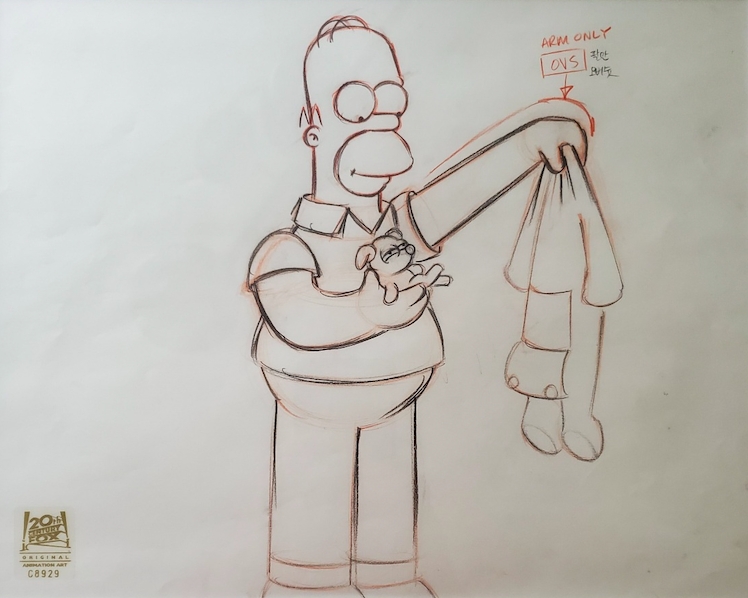 This is an original production drawing used in making an episode of The Simpsons. Episode "Two Dozen and One Greyhounds" April 9, 1995. Featured here are Homer Simpson and one of Santa's Little Helper's puppies.