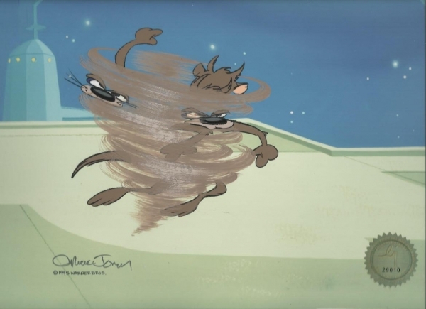 Original hand painted production cel featuring Taz. This is personally signed by Chuck Jones. SOLD CALL FOR SIMILAR IMAGE.