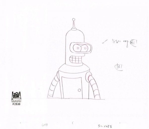 This is an original production drawing used in making an episode of "Futurama". Featured here is Bender. SOLD call for similar images.