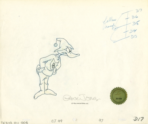 This is an original production drawing used in making "Duck Dodgers and the Return of the 24th 1/2 Century" 1980. Featured here is Daffy Duck. This is an estate signature of Chuck Jones.