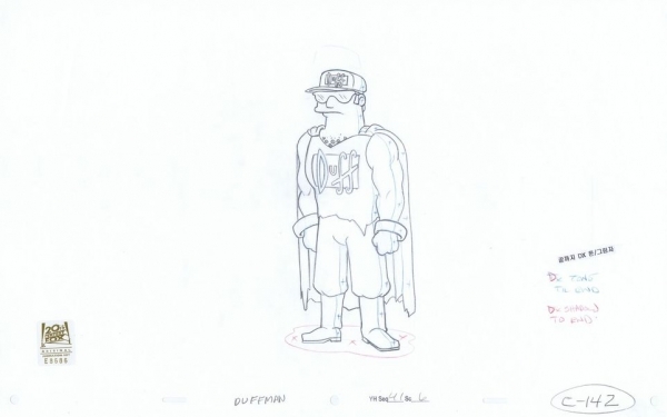 This is an original production drawing of Duffman used in making The Simpsons Movie. Homer accidentally causes a radioactive leak from the Nuclear Power Plant into the River which could doom Springfield forever. Homer must save the city and rescue his family. Springfield's usual characters all turn up in the first ever movie length version of the hit TV show, 18 years in the making.250