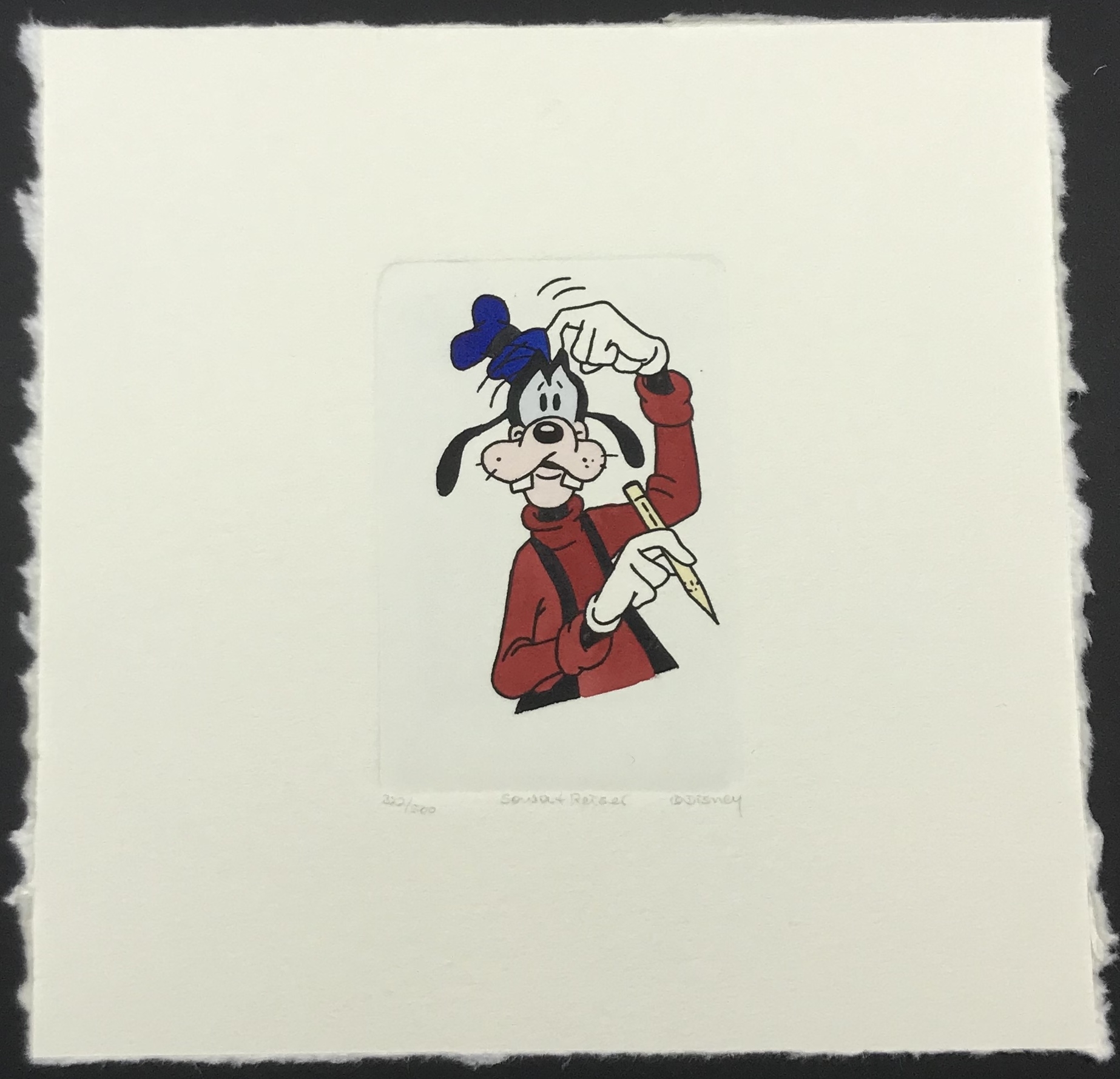 Goofy takes a try at painting. This animation art is a hand painted limited edition etching. Featured here is Goofy. Available framed for only $129US!