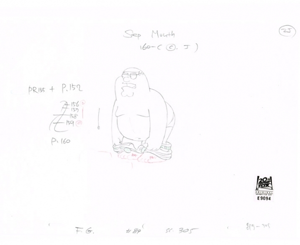 This is an original production drawing used in making Family Guy episode "Foreign Affairs". Family Guy follows the adventures of an endearingly ignorant dad, PETER GRIFFIN (Seth MacFarlane), and his hilariously odd family of middle-class New Englanders in Quahog, RI. LOIS (Alex Borstein) is Peter's wife, a stay at home mom with no patience for her family's antics. Then there are their kids: 17-year-old MEG (Mila Kunis) is a social outcast and the Griffin family punching bag; 13-year-old CHRIS (Seth Green) is a socially awkward teen who doesn't have a clue about the opposite sex; and 1-year-old STEWIE (MacFarlane) is a diabolically clever baby whose burgeoning sexuality is very much a work in progress. Rounding out the Griffin household is BRIAN (MacFarlane), the family dog, a member of Mensa with a penchant for dry martinis and dumb blondes. SOLD CALL FOR SIMILAR IMAGES.