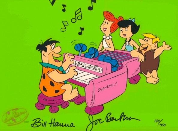 This is a hand painted limited edition cel. Featured here is Fred Flintstone, Wilma, Barney and Betty. Each is signed by Bill Hanna and Joe Barbera.725
