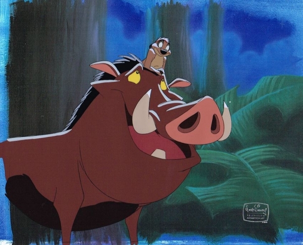This is an original hand painted production cel used in making an episode of Walt Disney's Television's animated series "Disney's Timon and Pumba." Premiering in 1995, "Disney's Timon and Pumba" follows the further adventures of The Lion King's Timon and Pumba as the "Hakuna Matata" life gets them into all kinds of jungle trouble - and adventure. SOLD CALL FOR SIMILAR IMAGES.
