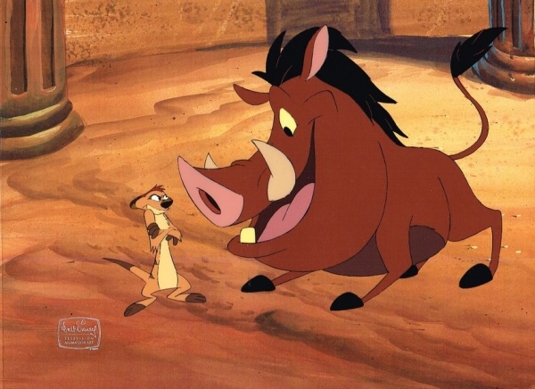 This is an original hand painted production cel used in making an episode of Walt Disney's Television's animated series "Disney's Timon and Pumba." Premiering in 1995, "Disney's Timon and Pumba" follows the further adventures of The Lion King's Timon and Pumba as the "Hakuna Matata" life gets them into all kinds of jungle trouble - and adventure. SOLD CALL FOR SIMILAR IMAGES.