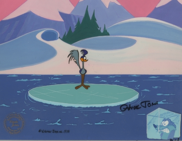 This is an original hand painted production cel of Wile E. Coyote and Road Runner used in making "Freeze Framed" 1979. This is personally signed by the late Chuck Jones. It is very rare to have both character together on one cel! this is accompanied by a hand painted non production background.SOLD
