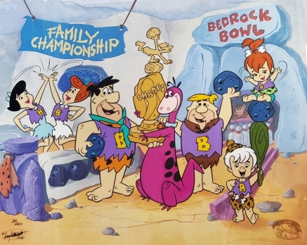 This is a hand painted limited edition animation cel. Yabba-Dabba-Doo! In this limited edition animation cel, Fred, Wilma, Pebbles and Dino join Barney, Betty and Bamm-Bamm Rubble to celebrate their victory in Bedrock Bowl's Family Championship. Twinkletoes Flintstone leads the team to victory, but the whole gang is definitely in A League of Their Own! 600