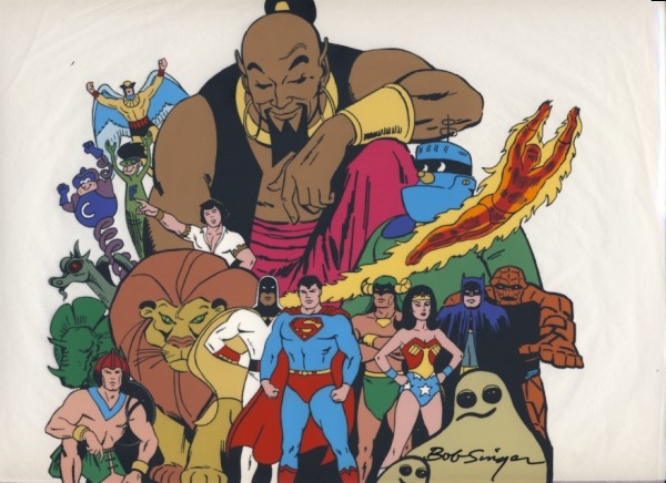 Publicity cel featuring Superman, Batman, Wonder Woman, The Thing, Space Ghost and many more! Signed by Bob Singer.