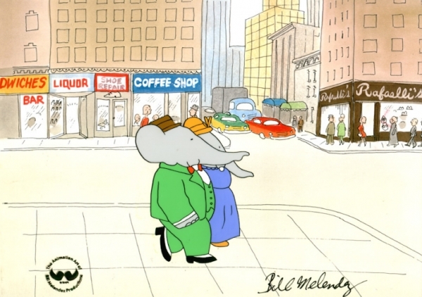 This is a hand painted production cel from "Babar ll" 1968. Featuring Babar, Celeste, Artur, Cornelius. This has been personally signed by the late Bill Melendez.