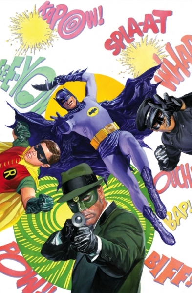 This is a limited edition giclee on paper. Signed by Alex Ross. This colorful cover art, featuring the Dynamic Duo along with the series' guest stars The Green Hornet and Kato, amidst the chaos of comic book action, has been featured on the cover of DC Comic’s and Dynamite’s tribute to the 1966 television episodes. The 1960’s Batman series staring Adam West and Burt Ward was (and still is) an integral part of the Dark Knight’s legacy. Alex Ross perfectly captured the likeness’ of Adam West, Burt Ward, Van Williams and Bruce Lee. The twelve part series of books staged by Kevin Smith debuted in May 2014. With luck, this collection will thrive and live on for generations of Batman and The Green Hornet fans to come. The Green Hornet was created in 1936 for radio broadcast by George W. Trendle and Fran Striker and was later featured in comics, a television series and a feature film and serials. Van Williams and Bruce Lee played the duo in the 70’s television series including the two-part Batman television crossover episode.