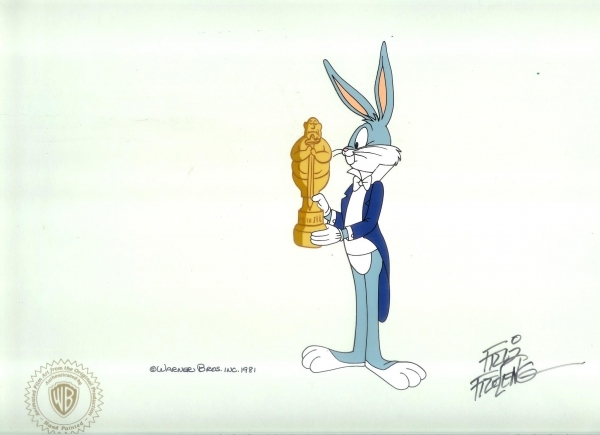 This is an original production cel featuring Bugs Bunny. This is signed by Friz Freleng.775