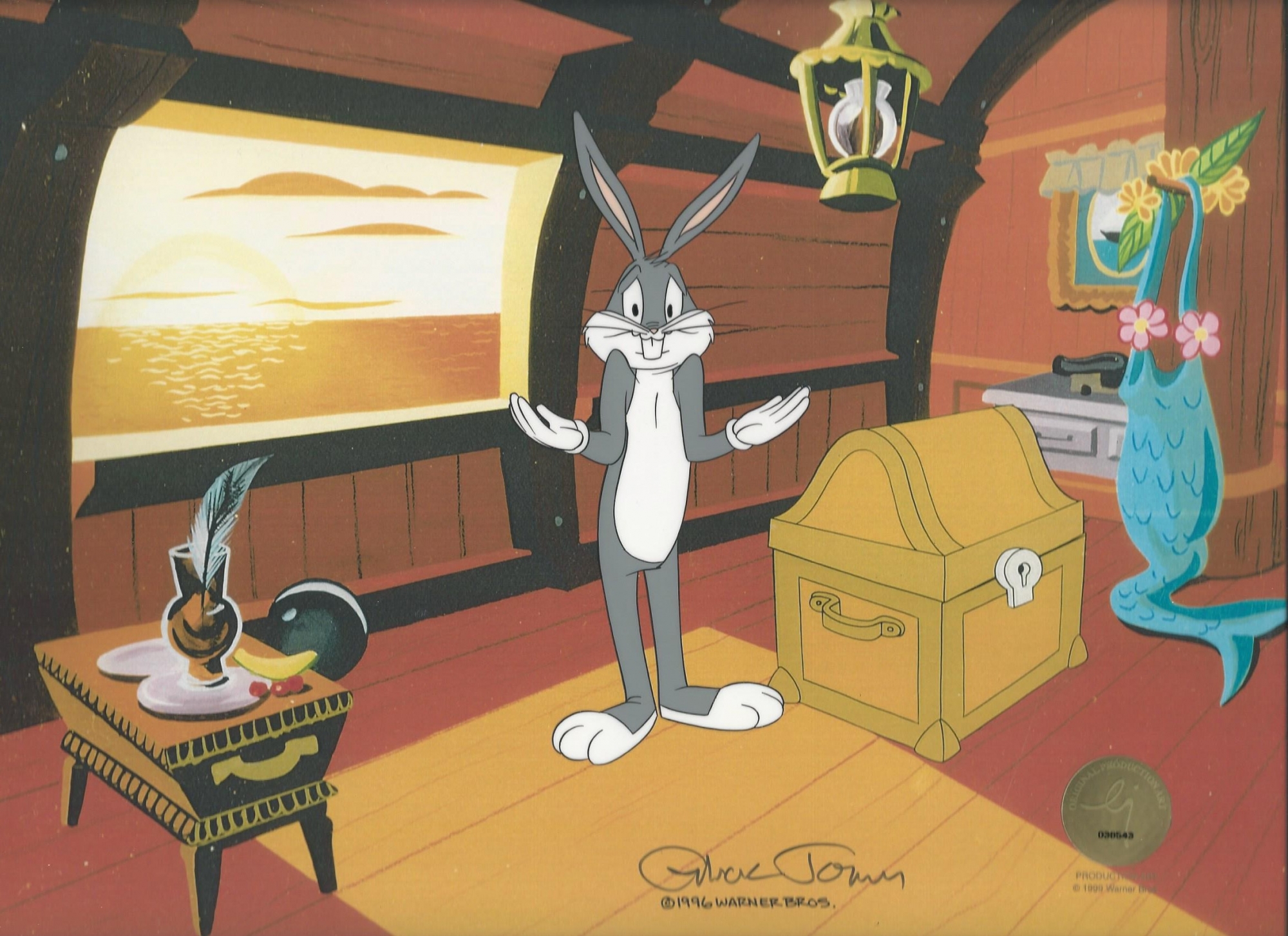 This is an original hand painted production cel featuring Bugs Bunny. This is signed by Chuck Jones. This was used in the making of "From Hare to Eternity" 1997. A Bugs Bunny and Yosemite Sam cartoon in the Looney Tunes series, directed by Chuck Jones. 1250