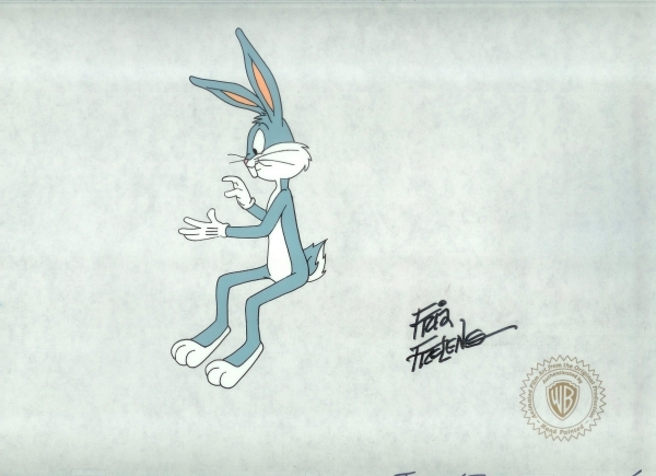 This is an original production cel of Bugs Bunny. Signed by the late Friz Freleng. 775