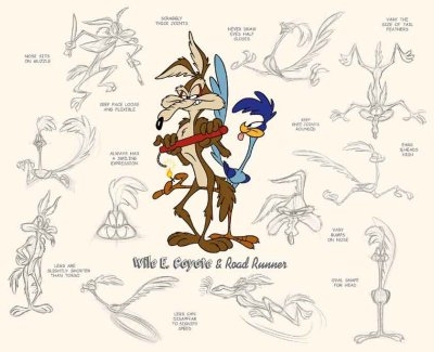 Both the Road Runner and Wile E. Coyote were created by Chuck Jones and appeared for the first time in the 1949 cartoon 'Fast and Furry-ous'. A model sheet insures that the personality and look of a character is executed with accuracy. The background was adapted from original model sheets and reproduced as a giclee.