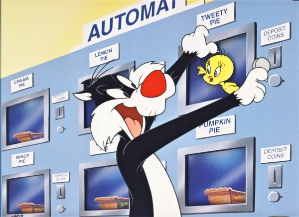 Hand painted limited edition animation cel featuring Sylvester and Tweety.