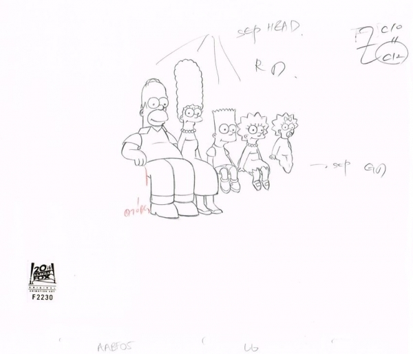 This is an original production drawing from the couch gag opening sequence of "The Simpsons". Episode title "Mayored to the Mob" Dec. 20, 1998. Couch gags are very rare and make for wonderful collectors' items. SOLD CALL FOR SIMILAR IMAGES.